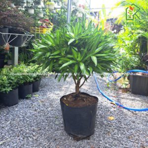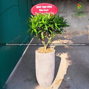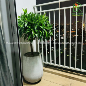Cây trúc bách hợp có tán xanh mướt có tán tròn đối xứng với chậu đá mài bầu sọc tạo nên sự cân đối hài hòa giữa cây, chậu và không gian xung quanh.