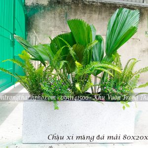 Chậu xi măng đá mài chữ nhật 80x20x30cm ( dài x rộng x cao) thích hợp trồng tre/ trúc/ chuối …. hoặc mix các loại cây với nhau. Chậu có bề ngang chỉ 20cm, phù hợp với ban công nhỏ hoặc lối đi hẹp.