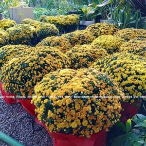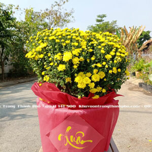Kích thước và quy cách sản phẩm: Bộ 3 chậu cúc mâm xôi tán từ 40-50cm được gói giấy đỏ và treo liễn chữ phúc lộc thọ.